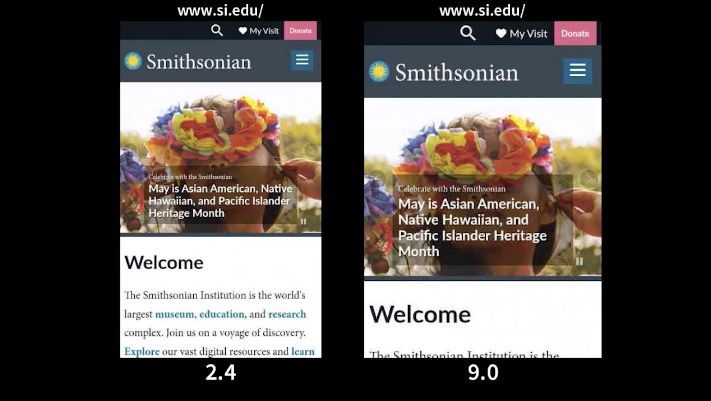 Compare these two loading experiences for the Smithsonian’s website. The one on the left is on a new iPhone on a fast internet connection and loaded in a little over 2 seconds. The one on the right uses a slow 4 G connection on a Motorola and takes almost 10 seconds. I recorded these videos with emulators on webpagetest.org.
